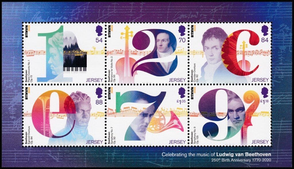 For Jersey’s 2020 commemoration of my main man Ludwig van, in avoiding the same old same old, Beethoven is all but lost within the graphical elements symbolizing some of his works — you can just make out the Stieler portrait within the “9” on the high value. In fact, as noted in the inscription, the sheet does not even commemorate Beethoven himself but, rather, his music.