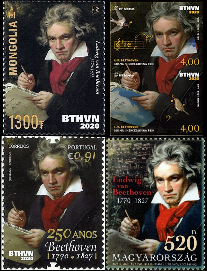 Not a lot of originality on display in those designs. Of course, one reason for the paucity of designs is the fact that this is the only known portrait for which Beethoven sat, during his lifetime. So, postal administrations have had to come up with their own ways to add a bit of variety. One way to do this was to make a tight crop of the image on the painting.