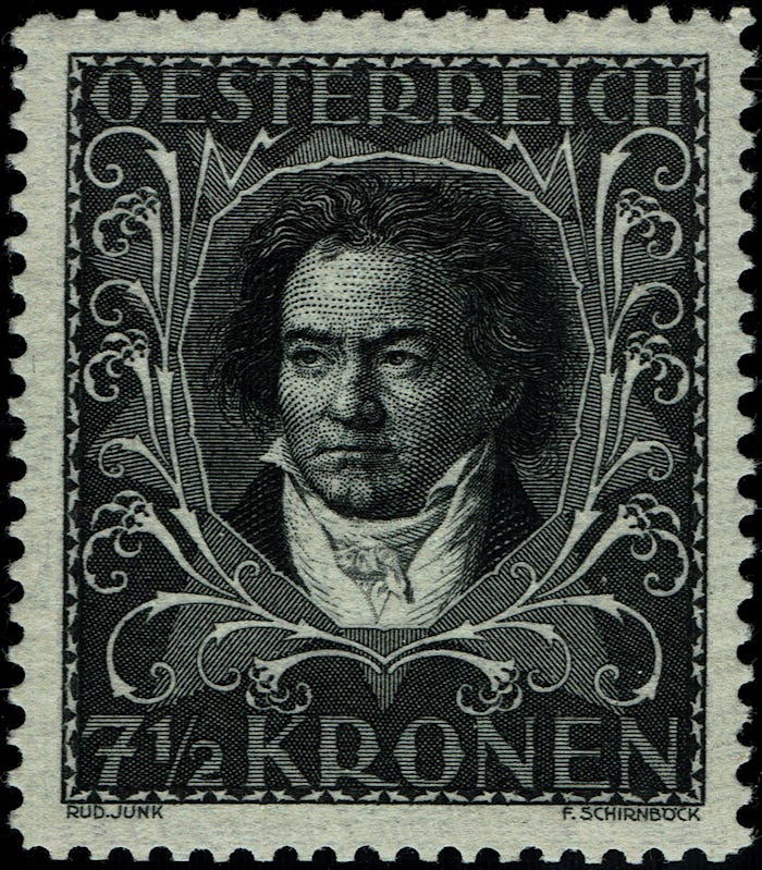 To be sure, the story of Beethoven on stamps is not all about the Stieler painting and the death mask. There are many paintings, drawings, and engravings which have been the source for designs on other Beethoven stamps, including this one, for which I have not been able to find the name of the artist, and which was the source for the first stamp to depict Beethoven — Austria, Scott Nr B52 (1922) — part of a 7-stamp set which was the first to show classical music composers.