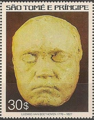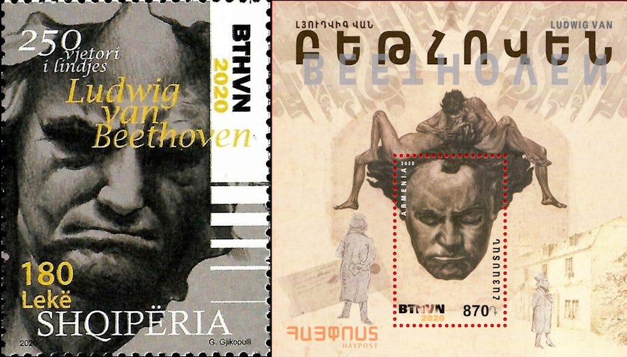 Some countries thought it might be a clever twist to celebrate the anniversary of his birth by showing him in death. These two, from Albania and Armenia depict Beethoven’s death mask. And what’s going on atop his head, on that Armenian stamp?