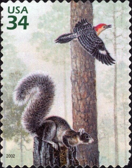 Other than blue jays, robins, and cardinals, I must have seen the red-bellied woodpecker more than any other bird depicted on an American postage stamp during this challenge. It’s unique in the sense that it is not an overly common bird like the cardinal or blue jay, nor is it dull or plain in appearance. The orange above the beak, flash of red on the back of it’s head, and the white and black pattern on the wings makes the red-bellied woodpecker quite pretty to look at. Plus the sound of it pecking against the wood was a pleasing noise to hear, always alerting me to the bird’s presence nearby. My one regret with this bird is that I was never able to acquire its stamp.