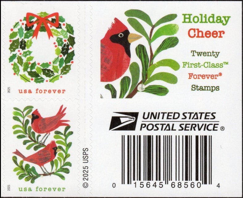 Yet we have 17 different stamps that show a cardinal, including USA #6036 (seen above), released just last fall for the 2025 holiday season. The cardinal is a pretty bird and I like it as much as anyone else, but did we really need to honor it 17 times? Couldn’t it have given up one of its philatelic spots to the belted kingfisher?